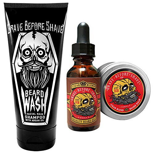 One 6oz. Tube of Grave Before Shave Beard Wash One 1 oz. dropper bottle of GRAVE BEFORE SHAVE Cigar Blend Beard Oil (Cigar/Vanilla scent) One 2 oz. Tin of GRAVE BEFORE SHAVE Cigar Blend Beard Balm (CIGAR/VANILLA SCENTED) Conditions and keeps Beards Healthy Perfect for all Beard lengths and styles