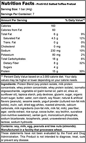 Studio : Fitness Connection Publisher : Fitness Connection Binding : Health and Beauty Product Description Balanced Protein Diet Salted Toffee Pretzel VLC Protein Bar is a delicious, satisfying Very Low Carb (VLC) weight loss snack bar to enjoy anytime of the day. Each serving provides 15 grams of protein, 5 net grams of carbohydrates and only 2 grams of sugar. 0