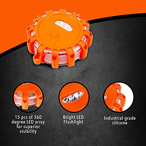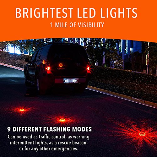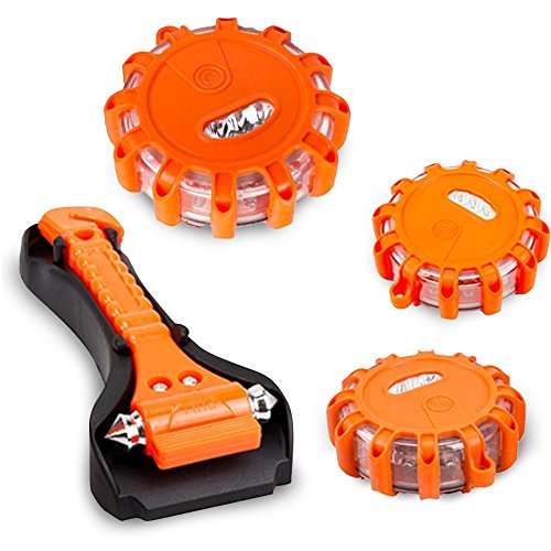 LED Road Flares | Set of 3 Waterproof, Industrial Grade lights with 9 Different Flashing Modes PLUS Safety Hammer Seat Belt Cutter/Window Breaker Escape Tool | Premium Roadside emergency kit