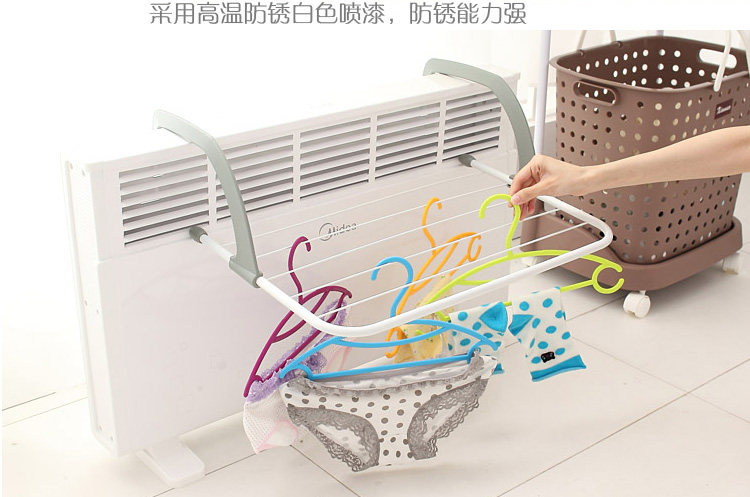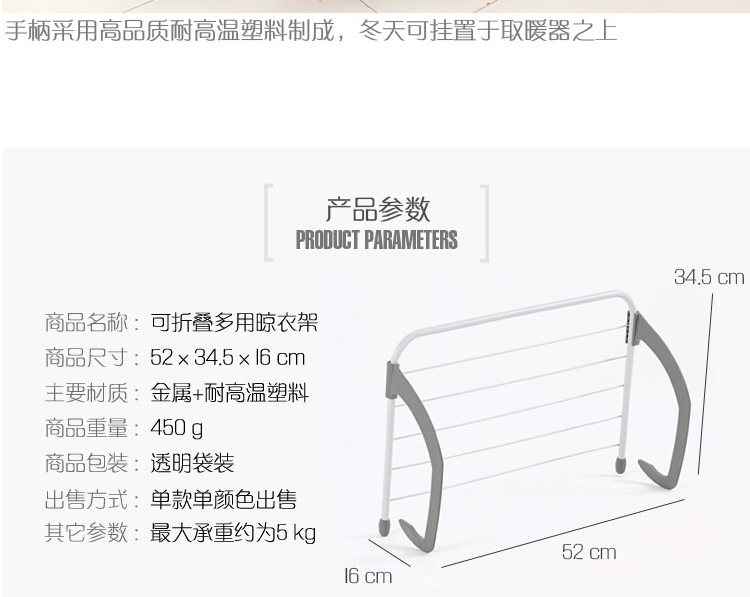 Product Name: Foldable Heating Rack Product Weight: 0.460kg Material: high quality metal + ABS material Product packaging: Blister + paper card Product size: 50 * 34 * 15cm Description: Can be folded to accommodate radiator racks, racks towel rack quality metal + ABS material, safe non-toxic temperature can reach 70 degrees, the end of the scratch-proof anti-skid mesh design to increase structural stability load-bearing up to 5KG folding design when not convenient Storage balcony glass bathroom radiator, etc. can be hung everywhere scarves clothes towel ready to hang