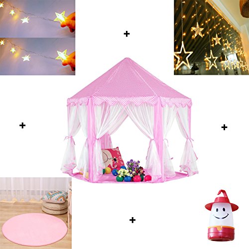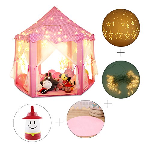 DIMENSION: Zelt 55"(Durchmesser) x 53" (H) speziell Sechseck, perfekt Grossen Raum bieten, geben Ihren Kindern viel Platz zu stehen und zu spielen, sogar ein Erwachsener reinpassen kann. 6miles umfasst 40 * kleine Sterne Licht Aroung die Spitze der Playtent, 12 hangen mittleren und grossen Sternenlicht verwenden AAA Batterien fur Sie, super sicher Warm soft pink-Matte unter dem Zelt, ein kleines Lacheln Licht hangen in Ihrem Zelt im Inneren