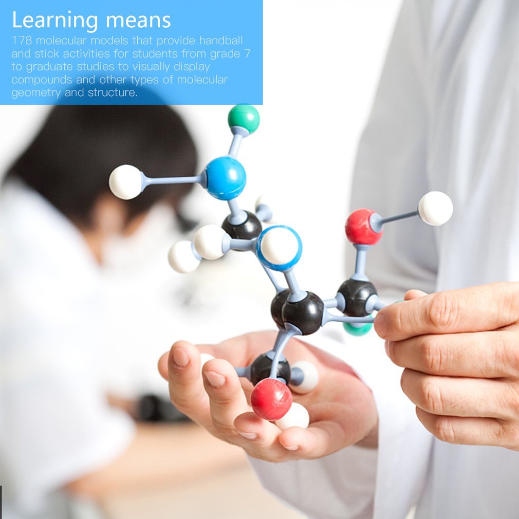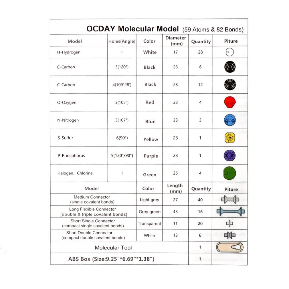 Durable, high quality plastic atoms are color coded to universal standards and contain instructions to easily identify all atoms and bonds in the box.