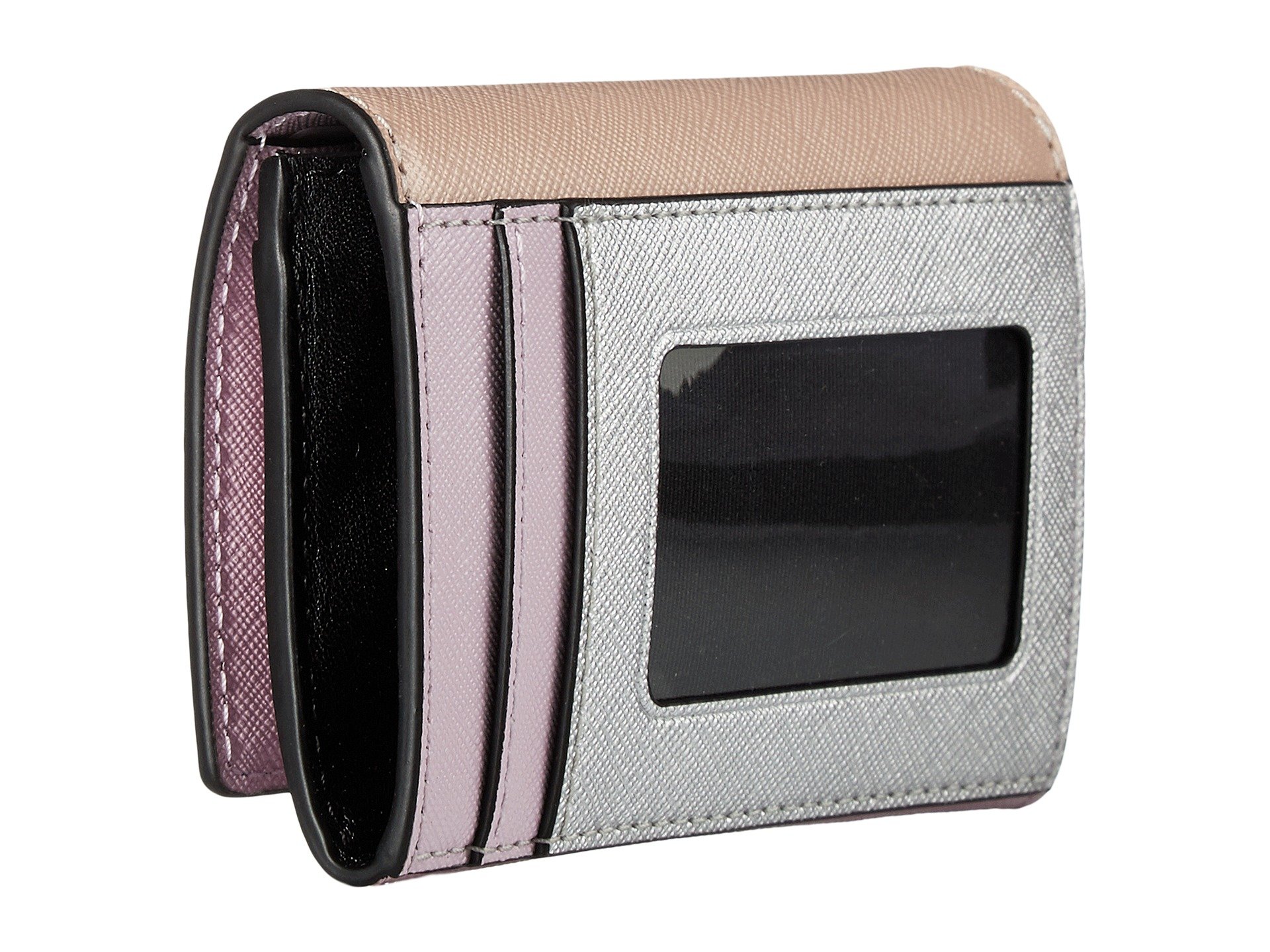 | Product Information SKU: #8915834Treat yourself to uncompromising style and beauty while carrying the Marc Jacobs™ Saffiano Color Blocked Multi Wallet.Wallet made of 100% leather. Fold-over flap with snap button for closure.Brand name hardware at front. Soft leather lined interior features center zipper pocket, two wall slide pockets and seven credit card slots for desired storage with additional ID window.Imported. This item may ship with an attached security tag. Merchandise returned without the original security tag attached or a damaged tag may not qualify for a refund.Measurements: Bottom Width: 4 1?2 in Depth: 1 in Height: 3 in Weight: 3 oz |