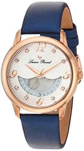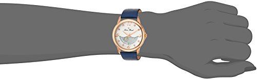 Silver textured dial w/rose gold tone hands and arabic numerals, 8 white crystal and rose gold tone hour markers; rose gold tone ion-plated stainless steel case; navy blue leather strap w/satin finish