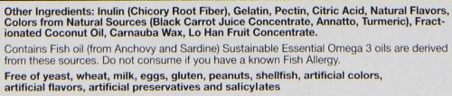-. Feature : 10 ESSENTIAL NUTRIENTS PLUS WILD-CAUGHT OMEGA 3 FISH OIL for brain health* / 4 g PREBIOIC FIBER for digestive health* / 1/2 g SUGAR PER GUMMY from inulin syrup and GRAS-certified lo han fruit / VITAMIN D3 for bone health* / NON-GMO. ALLERGEN-FREE. NO SYNTHETIC COLORS OR FLAVORS.