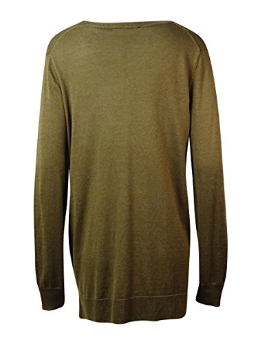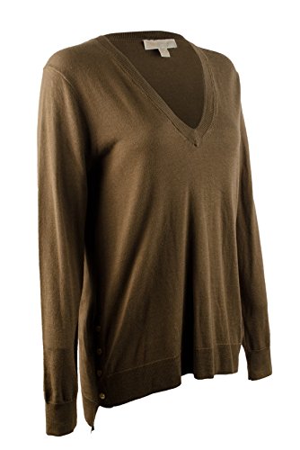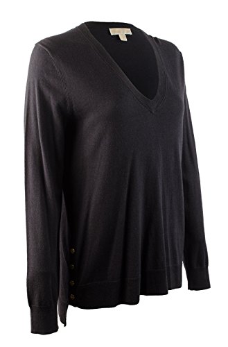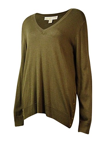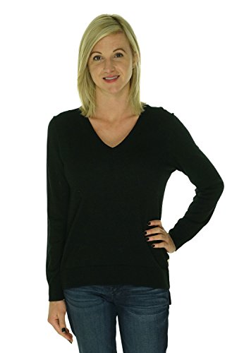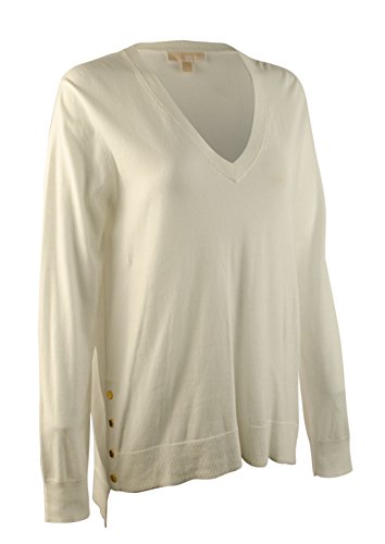 58% Cotton, 42% Rayon, Women's stylish V-neck sweater featuring golden snap accents on sides, ribbed cuffs, high low ribbed hem