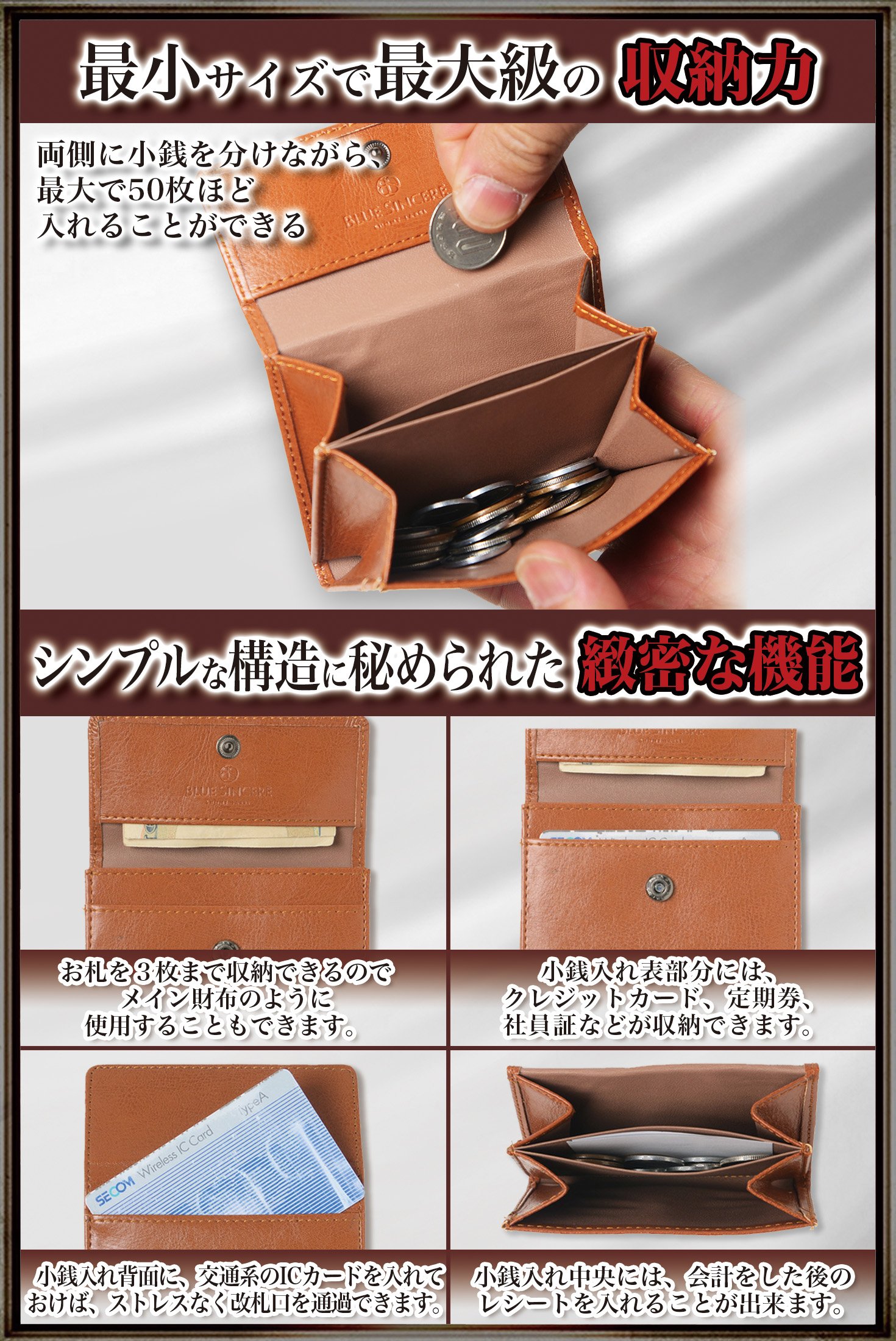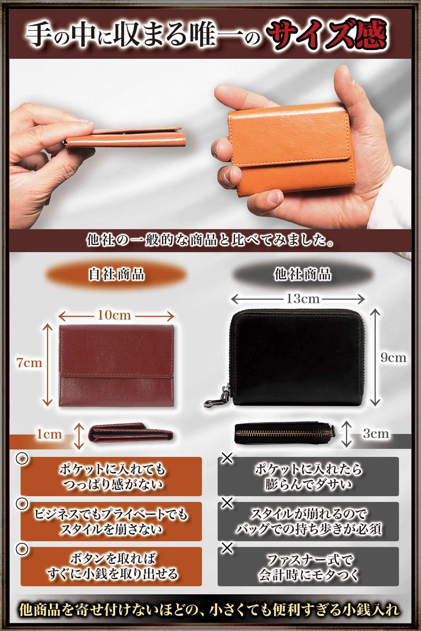 Because it is so big that it will protrude from the hand to put the small change main, I adopted the stop button formula for the fastener formula.