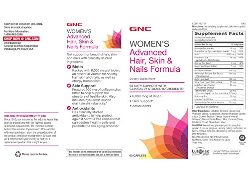 Beauty Support with Clinically Studied Ingredients 6,000 mcg of Biotin Skin Support Antioxidants Get support for your beautiful hair, skin and nails with clinically studied ingredients. Biotin Packed with 6,000 mcg of biotin, an essential vitamin for healthy hair, skin and nails, as well as energy metabolism. Skin Support Features 500 mg of collagen plus lutein to help support the structure of healthy skin. Also includes hyaluronic acid to maintain skin elasticity. AntioxidantsHas clinically studied antioxidants to help protect against harmful free radicals that can destroy healthy cells and promote the cell aging process. Physician Endorsed This product is endorsed by the GNC Medical Advisory Board. This team of esteemed physicians utilizes their extensive medical knowledge and experience to aid in the creation of GNC premium products, helping you to achieve optimal health through comprehensive nutritional support so you can live your best life GNC Quality Commitment For more than 79 years, GNC has been the leader in the development of superior nutritional supplements. Our products are produced using only fresh, high-quality ingredients and are manufactured under the strictest quality controls.Feature