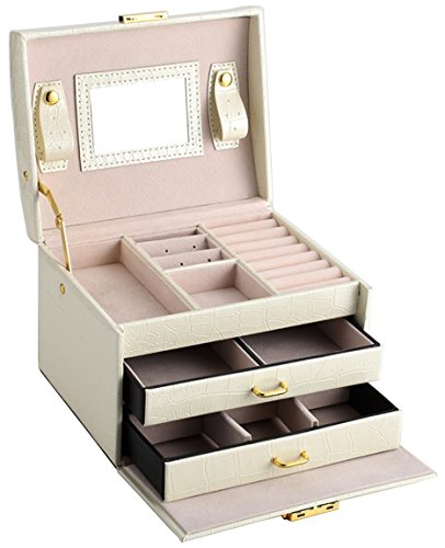 -. Feature : Excellent layout design, attractive appearance, simple structure and fine workmanship, Material: Faux Leather surface, MDF, Velvet / Size (LXWXH): 6.9"x5.5"x5.1" (17.5x14x13cm) / 3 layers with in-built mirror and earring belts, perfect for any trip! Locked with a key / Varied sections organize your bracelets, necklaces, rings, watches, cufflinks and badges in good order / A whole row of earring holders, it's lockable and comes with keys