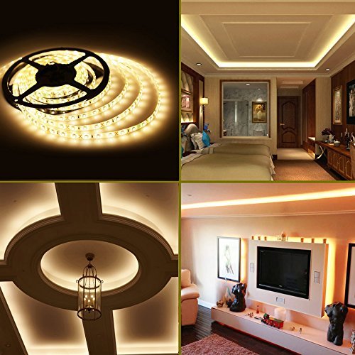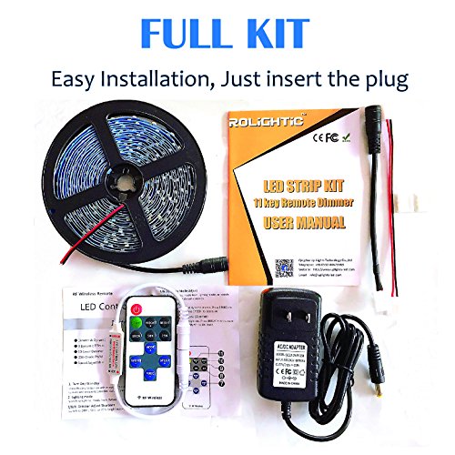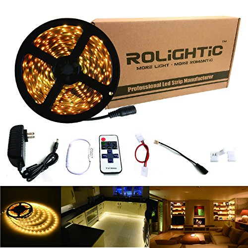 RoLightic LED Strip Light 16.4ft 300leds Warm White 3000K 3528 Led Tape Lights Full Kit with RF Remote Dimmer & 2A Power Supply for Home Lighting, Indoor Decoration (Warm White)