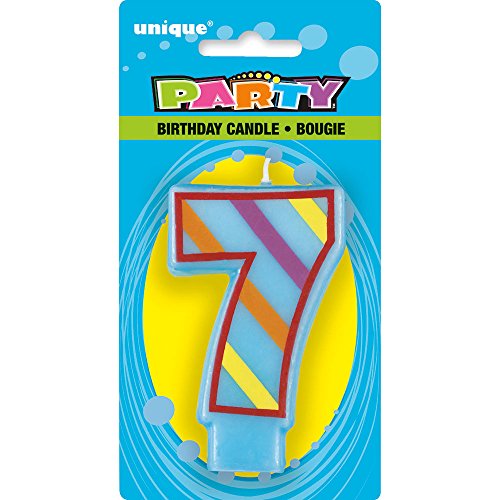 - Number 7 Candle measures 3.5" tall and is printed on one side with a colorful striped pattern