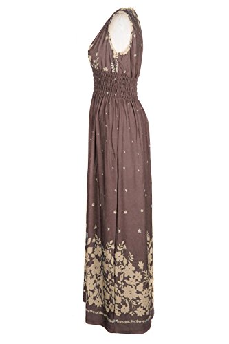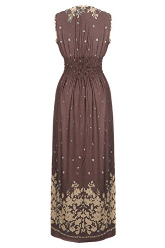 Sleeveless long smocked dress featuring a bohemian inspired bright bold printed pattern all throughout for the spring summer season. Surplice crossover v-neckline and a fitted smocked stretch construction accenuating the waistline. Ruched tie and smocked details at shoulders and a lengthy dress in a top quality medium weight jersey stretch knit for softness and comfort.Feature