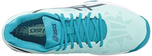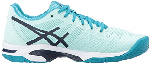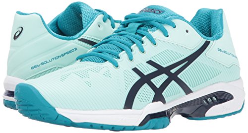 -. Binding : Apparel -. Brand : ASICS -. Color : Glacier Sea/Indigo Blue/Arctic Aqua -. Department : womens -. Feature : Rearfoot and Forefoot GEL® Cushioning Systems: Attenuates shock during impact and toe-off phases, and allows movement in multiple planes as the foot transitions through the gait cycle. / PGuard® Toe Protector: Enhanced toe durability. / Flexion Fit Upper: ProP.R.Ietary upper which provides form fitting comfort without sacrificing support. / P.H.FTM (Personal Heel Fit) Collar Lining: 2 layers of memory foam line the collar and mold to the athlete's heel, creating a personalized fit. / Solyte Midsole Material: A lighter weight midsole compound than ASICS' standard EVA and SpEVA. Also features enhanced cushioning and durability. -. Label : ASICS -. Manufacturer : ASICS -. PackageQuantity : 1 -. ProductGroup : Shoes -. ProductTypeName : TECHNICAL_SPORT_SHOE -. Publisher : ASICS -. Studio : ASICS -. Title : ASICS Women's Gel-Solution Speed 3 Tennis-Shoes