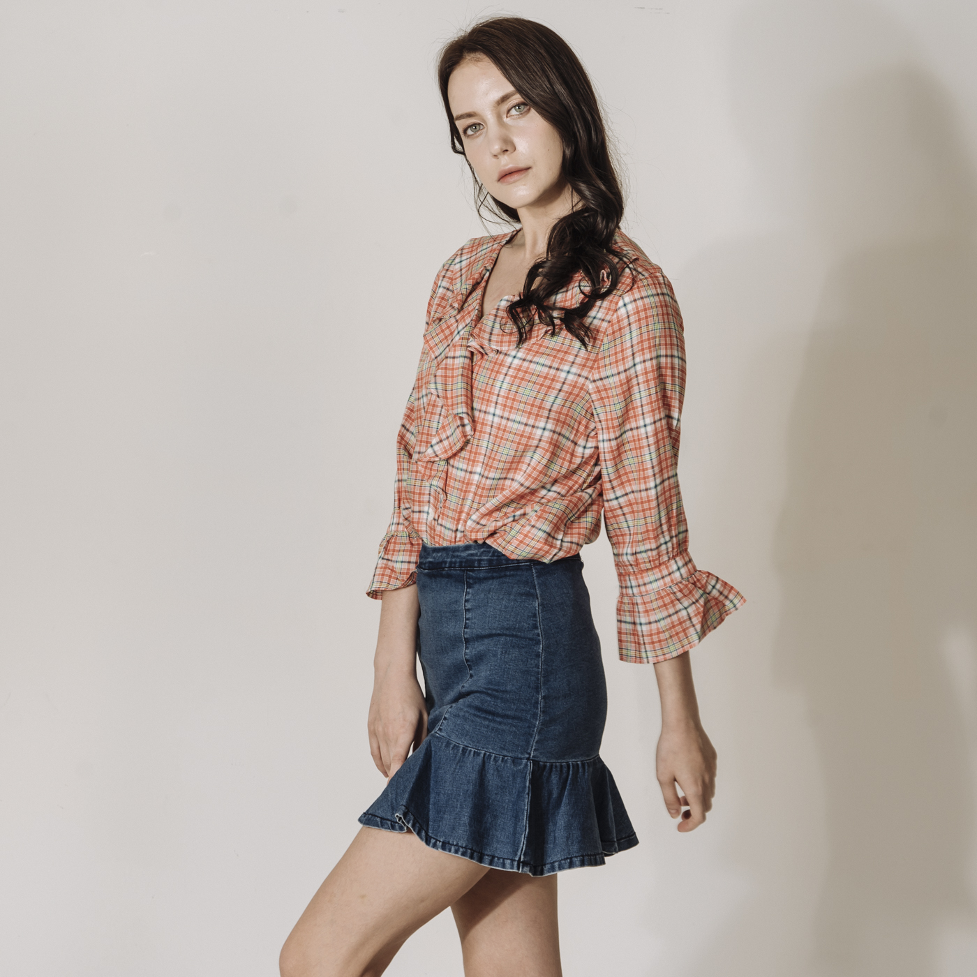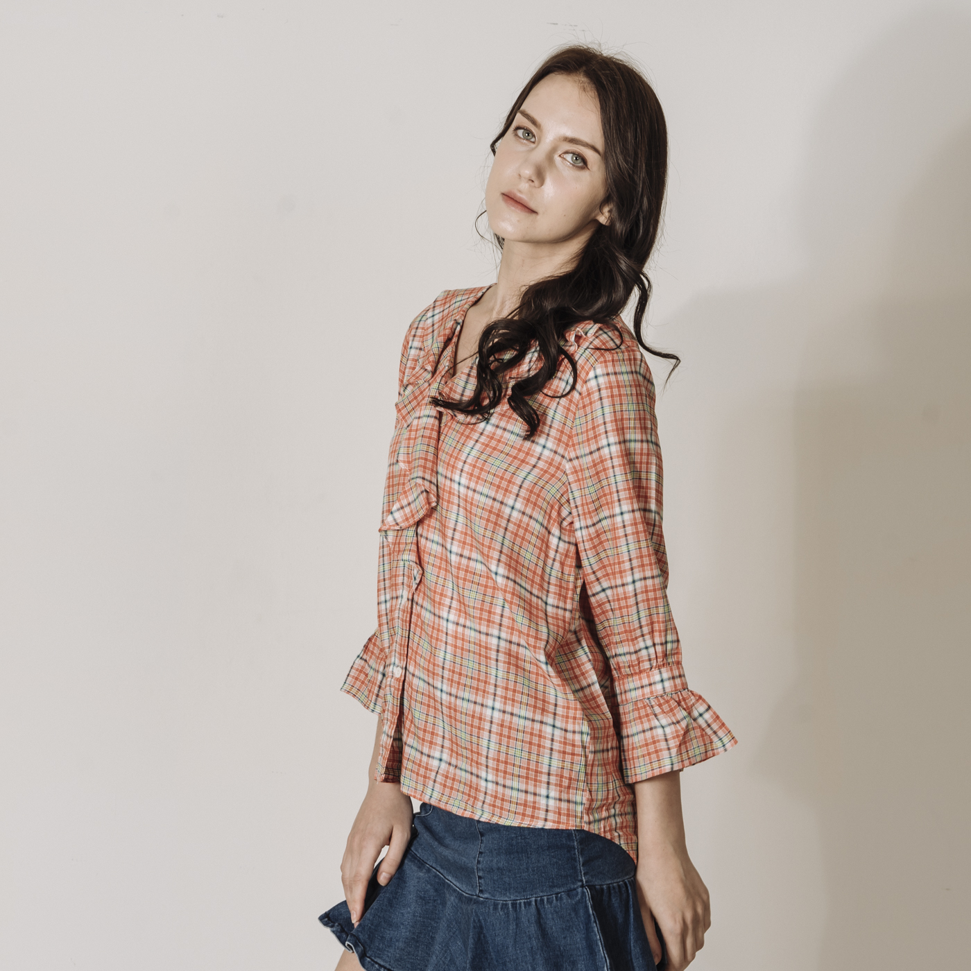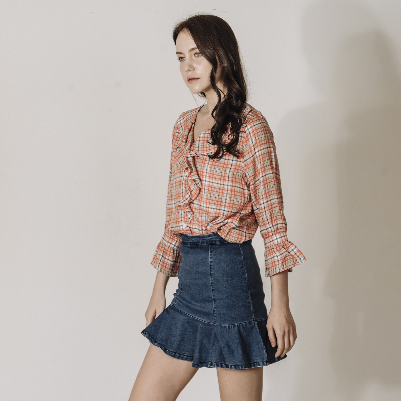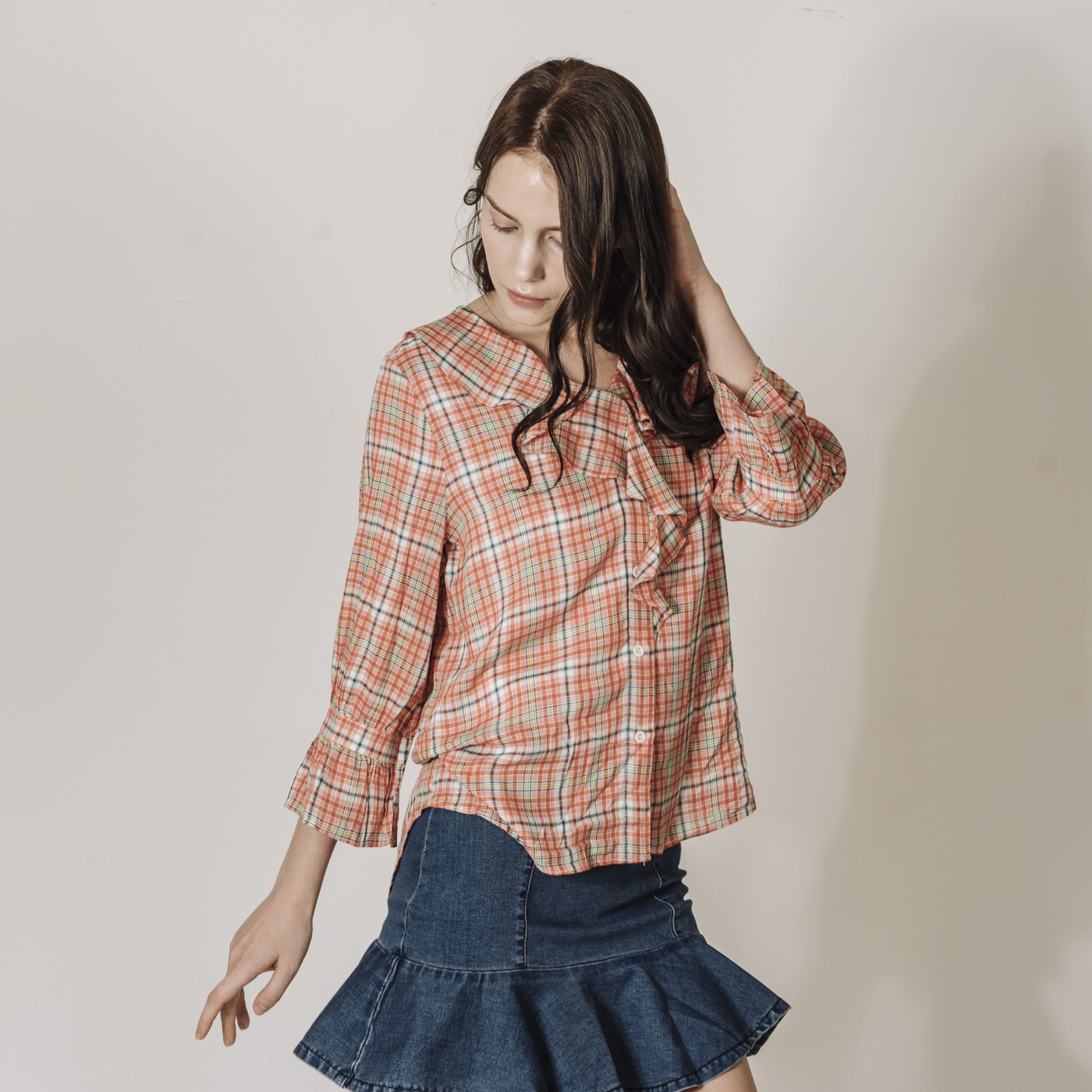 상큼한 레드 체크에 프릴의 디테일이 귀여운 스타일입니다.