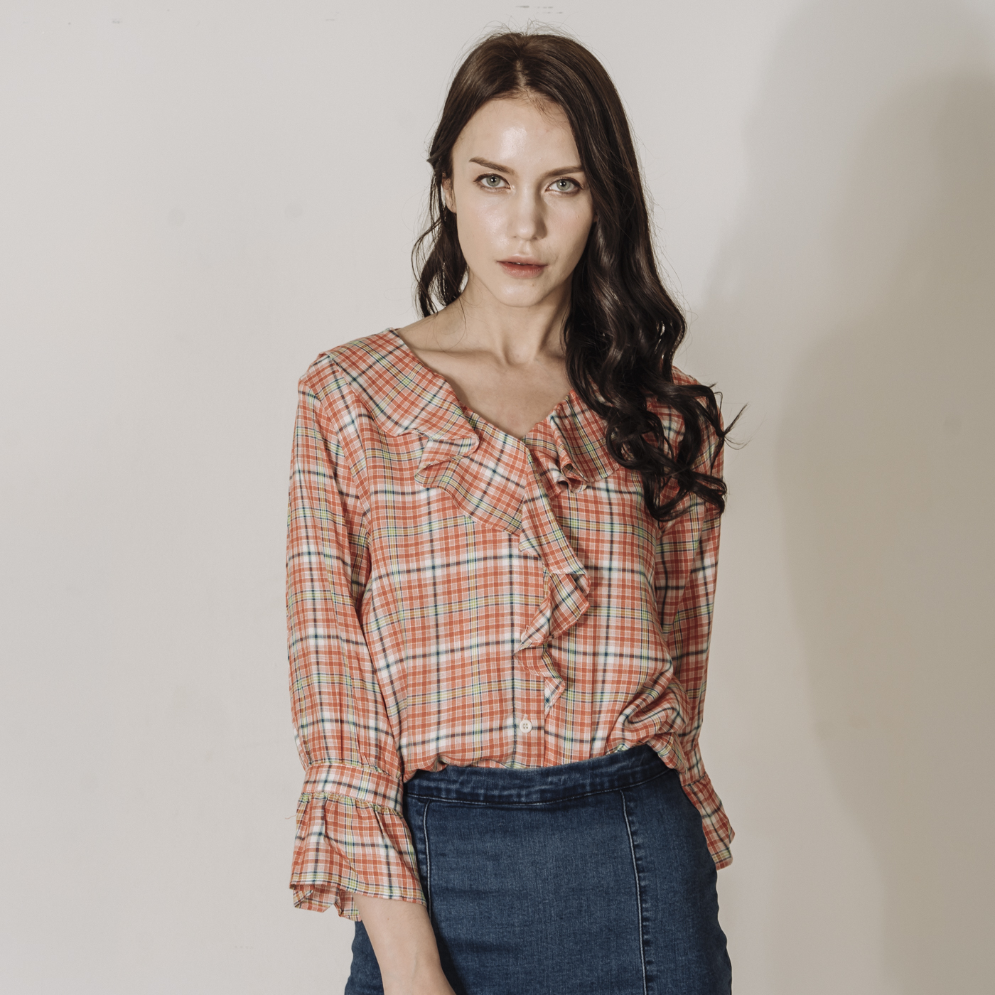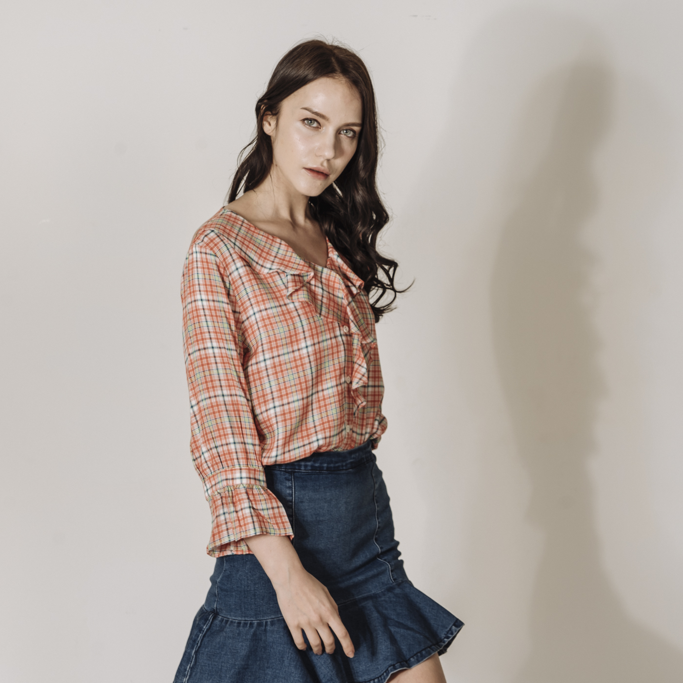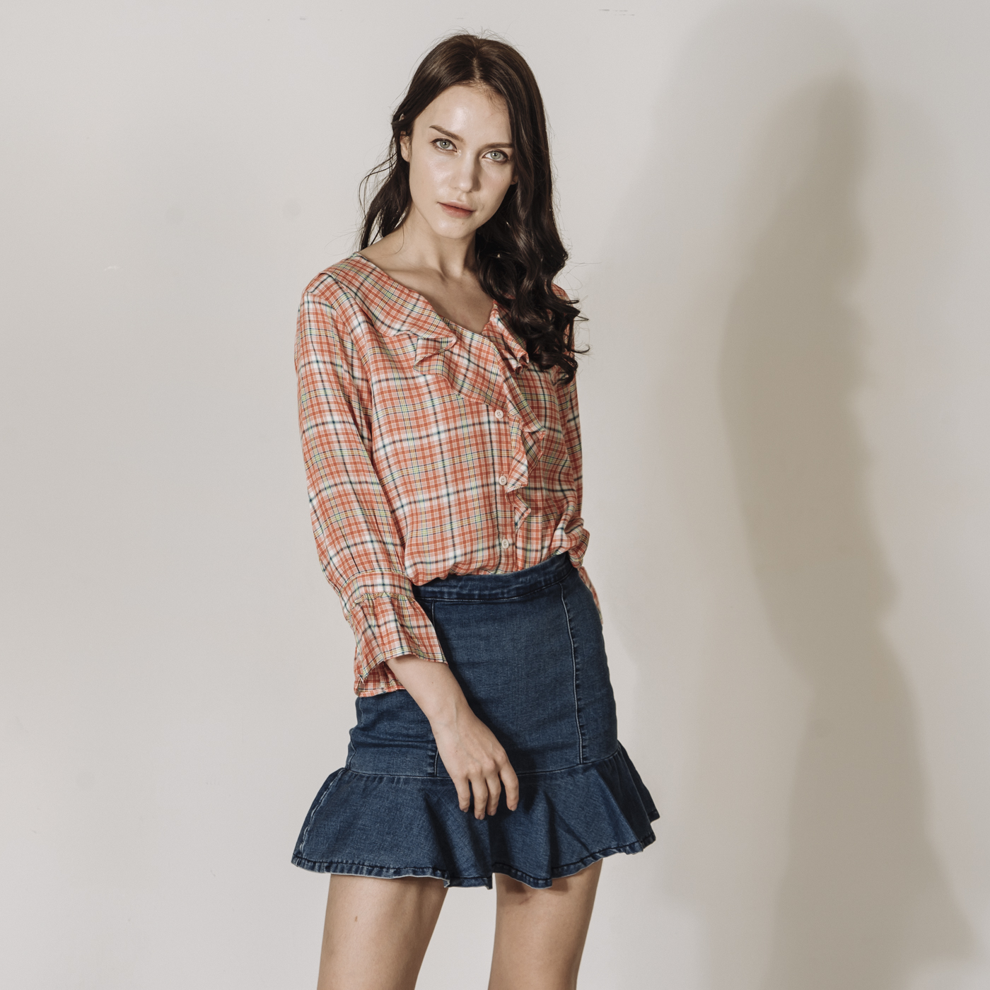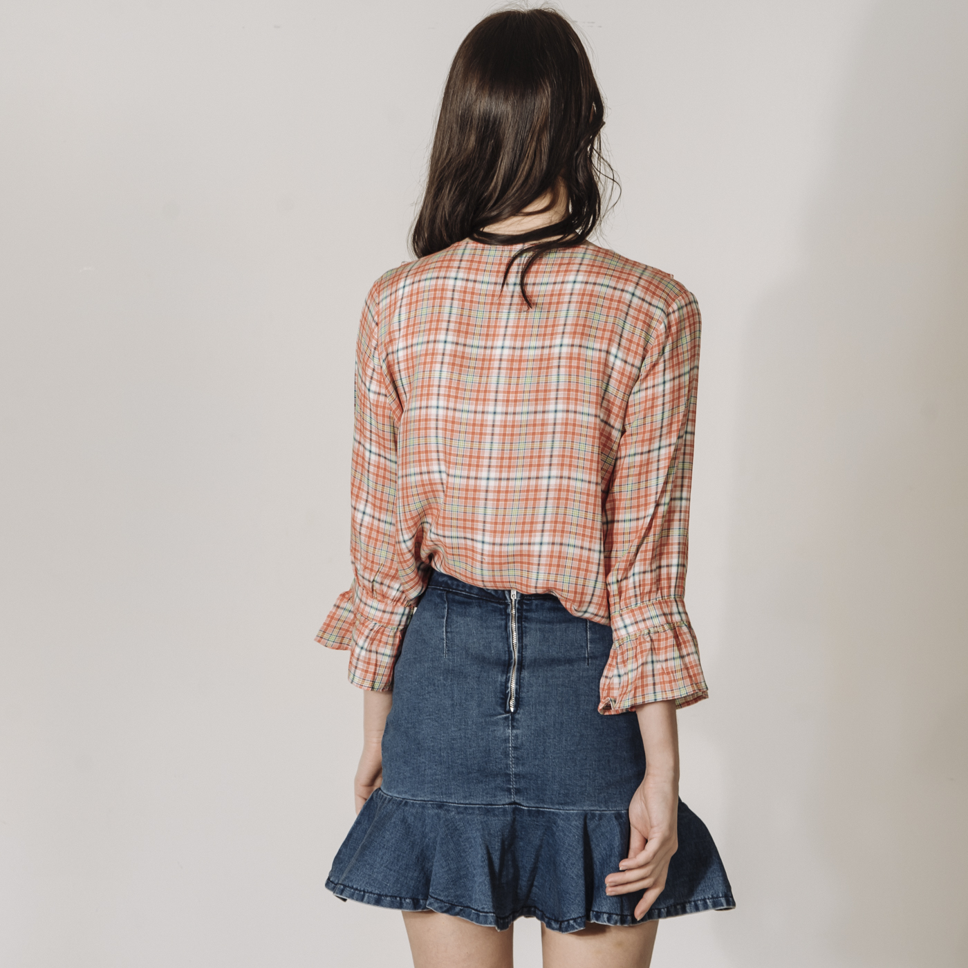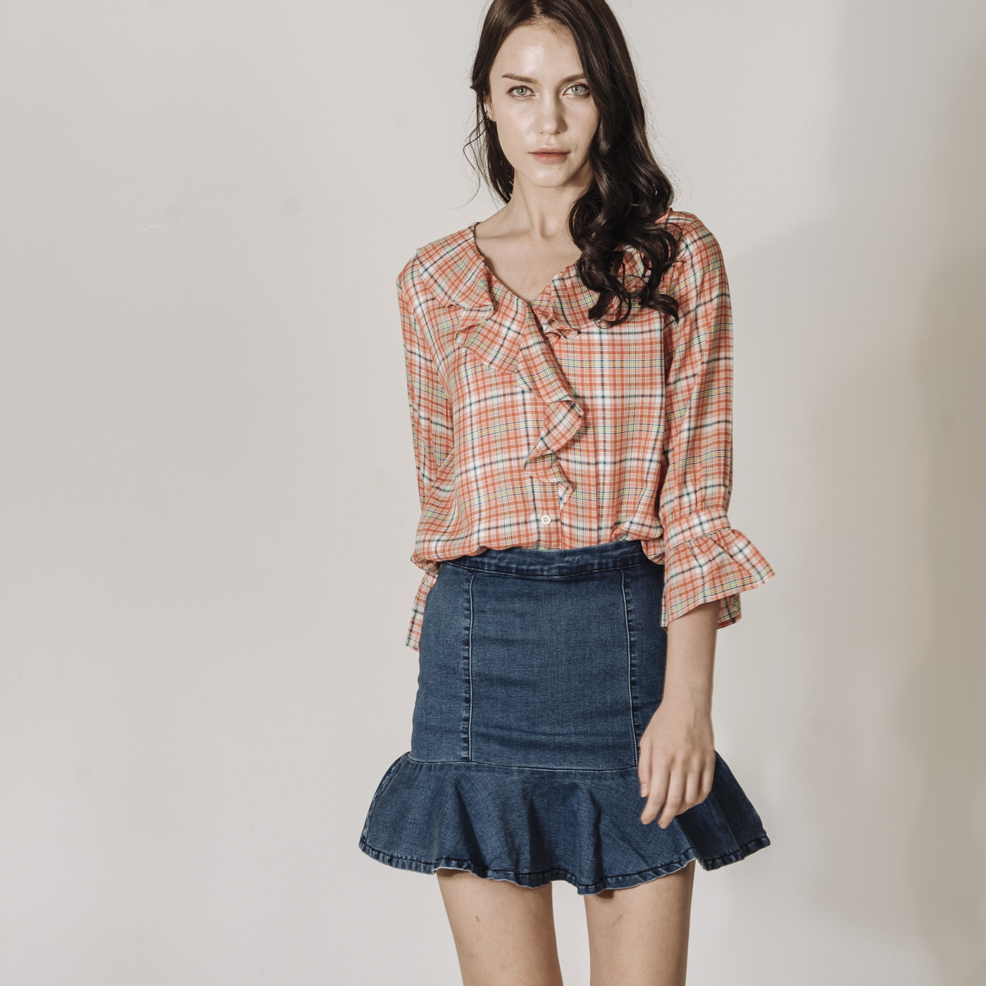 상큼한 레드 체크에 프릴의 디테일이 귀여운 스타일입니다.