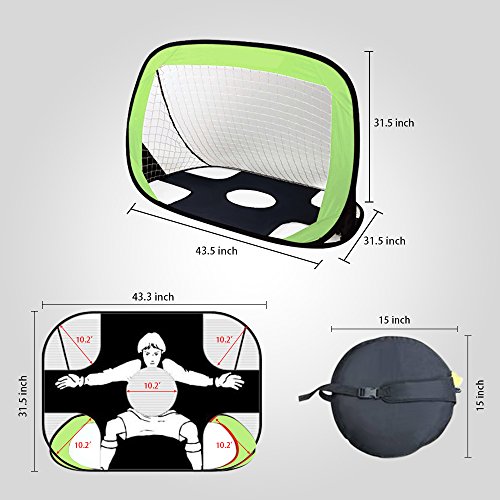 Specification Material: Soccer goal (300D waterproof and anti tear oxford fabric), Net (4.0 MM diamster wowen mesh) Weight: 1.2KG Size: 43.5*31.5in Package Size: 15*15in
