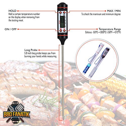 - DIGITAL FOOD THERMOMETER: With a long sensor probe & quick temp display you will get results at a safe distance in less than 10 seconds - so no guesswork & no leaving food uncovered any longer than needed; PLUS the 58˚ to +572˚ Fahrenheit temperature range tells you when meat is thawed or completely cooked for added peace of mind