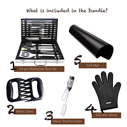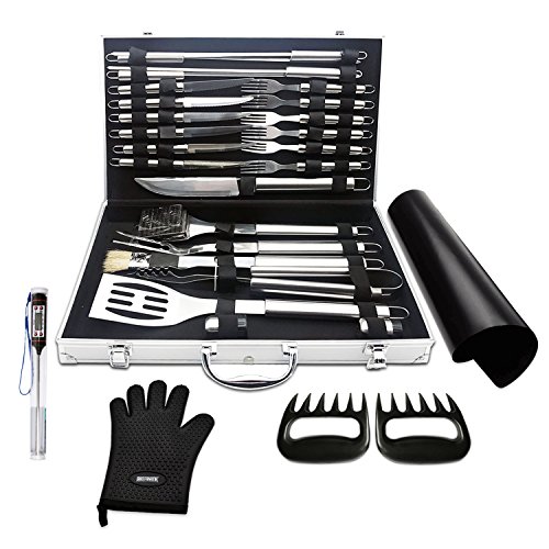 BBQ Fanatik BBQ Tool Set - 28 Piece w/ Meat Claws Shredder, Digital Food Thermometer, Grill Mat & Glove for a Complete Accessories Bundle