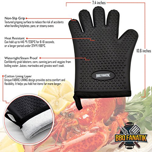 - SILICONE COOKING GLOVE: With food-grade silicone, a textured surface and cotton lining this glove resists temperatures from -40 to +445 degrees Fahrenheit, keeping you safe and comfy all the way from freezer to grill