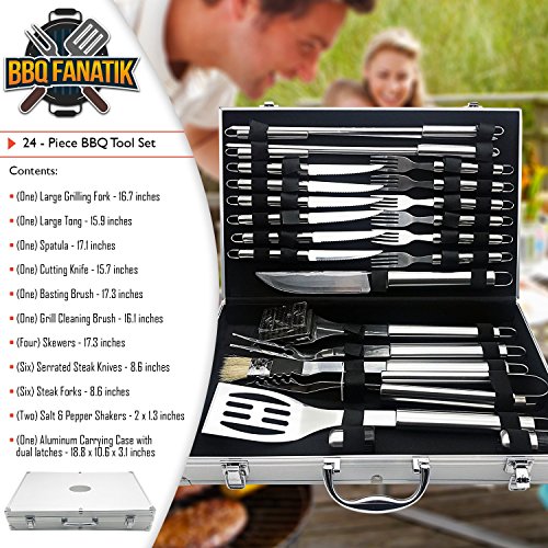 - STAINLESS STEEL BBQ TOOLS: The food-grade, stainless steel tool set includes, basting brush, spatula, grilling fork, cleaning brush, tongs, cutting knife, 4 skewers, 6 knives, 6 forks and 2 salt-n-pepper shakers - all in a travel case that packs everything away to arrive to your next BBQ in style
