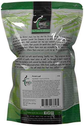 -. Binding : Grocery -. Brand : Special Tea -. EAN : 0852659276165 -. Feature : The USDA Certified Organic leaf Pu'erh tea has the body and character of black tea but it's the medicinal properties that are thought to be present that set it apart. / In China this tasty tea has long been used as a powerful digestive aid and natural detoxifier. But even more remarkable is the sested cholesterol lowering benefits that have been experienced by so many. / Each packet of 8 oz. tea is individually handmade. / Shipped in resealable foil pouch to help retain freshness. / Makes about 100 cups of tea. -. Label : Special Tea -. Manufacturer : Special Tea -. Model : 852659276165 -. MPN : 00-1NW2H0-83 -. NumberOfItems : 1 -. PackageQuantity : 1 -. PartNumber : 00-1NW2H0-83 -. ProductGroup : Grocery -. ProductTypeName : GROCERY -. PublicationDate : 2013-07-15 -. Publisher : Special Tea -. ReleaseDate : 2013-07-15 -. Size : 0.8 Ounce -. Studio : Special Tea -. Title : Special Tea Loose Tea, Pu'erh Leaf,8 Ounce -. UPC : 852659276165