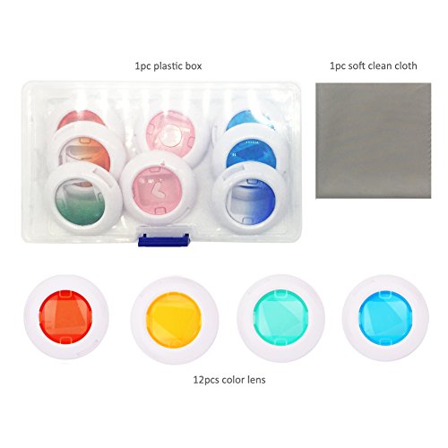 12 Pieces close-up lens-4 pieces color filter, 4 pieces hollow out color filter, 4 pieces gradient color filter and a clear plastic box, cleaning cloth