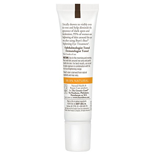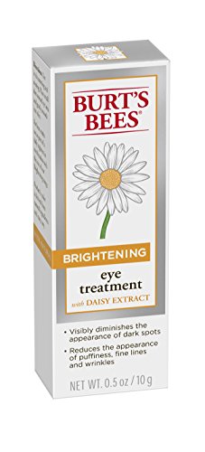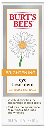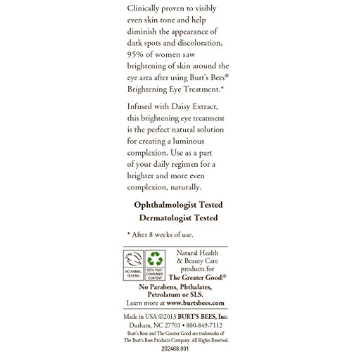 ReleaseDate : 2014-01-02 Studio : Burt's Bees Publisher : Burt's Bees Binding : Health and Beauty Product Description A natural eye treatment to visibly diminish the appearance of dark spots. Burt's Bees Brightening Eye Treatment is clinically shown to visibly even skin tone and to help diminish the appearance of dark spots and discoloration while reducing the appearance of puffiness, fine lines and wrinkles around the eye area. Infused with Daisy Extract, this brightening eye treatment is the perfect natural solution for creating a luminous complexion. After 8 weeks of use, 94% of women saw brightening of skin around the eye area. It's 99% natural and is most effective when used as part of a daily regimen in combination with the Brightening line. Plus, it contains no parabens or phthalates and is ophthalmologist and dermatologist tested. Put the power of nature to work for your skin with Burt's Bees. 0