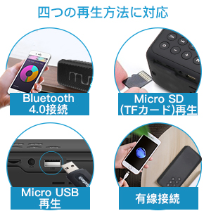 接続方法:Bluetooth, MicroSDカード,USBメモリー,AUX(有線接続)