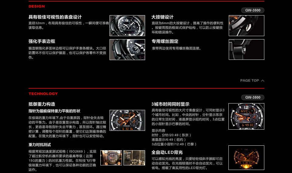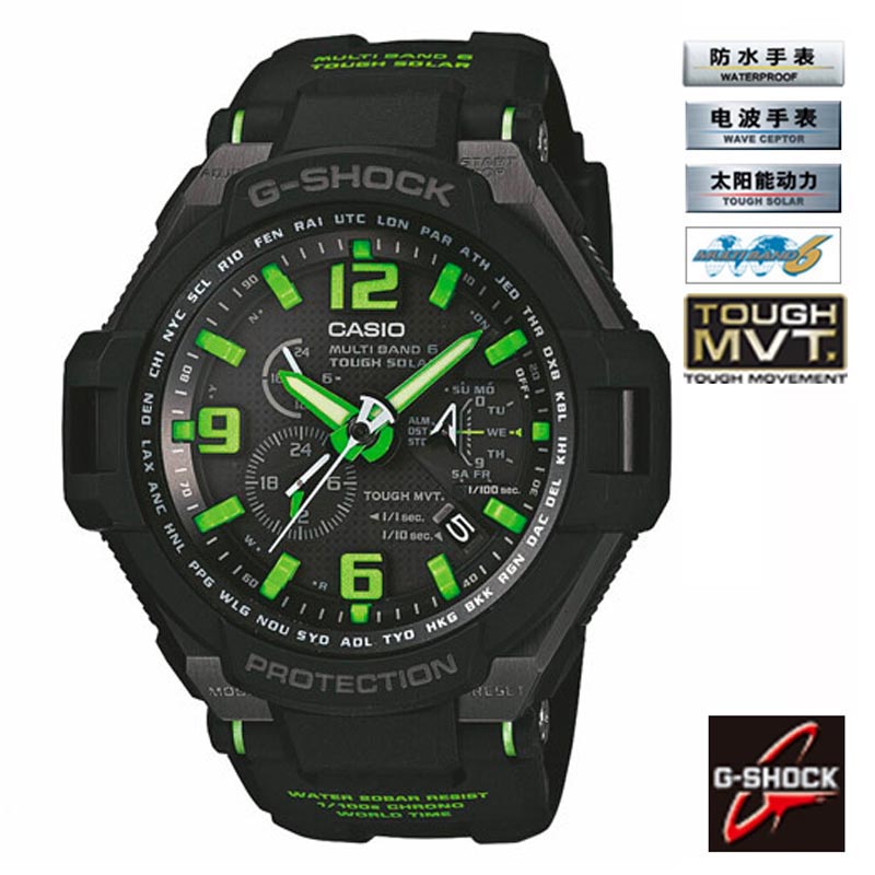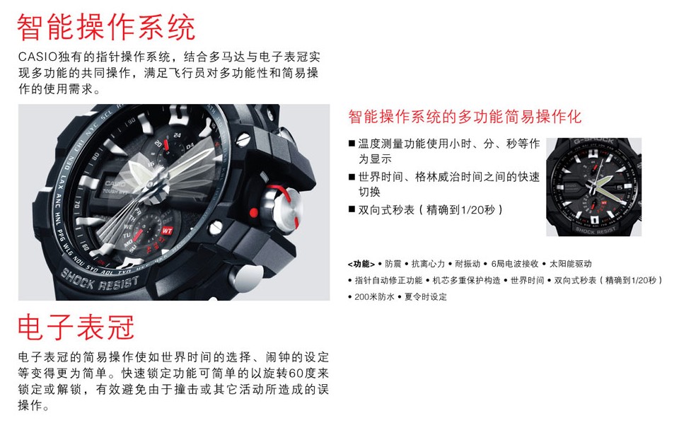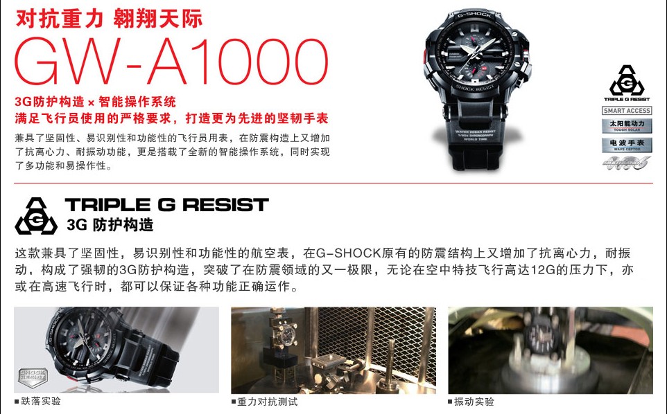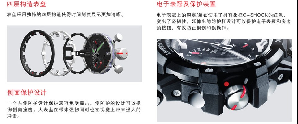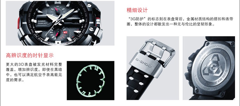 为G-SHOCK最强的航空手表,所有的内部配件经过严酷的环境测试都被强化.在航空理念的辨识性上,再次增加了操纵性,已真正成为航空手表的代名词。表款搭载了SMART ACCESS 智能操作系统,开发了追求终极的(防震、耐振动、抗离心力)的3G防护构造。
