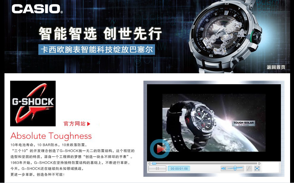 卡西欧CASIO手表是日本手表三大品牌之一,多年来以真正多功能的G-SHOCK手表著称于世。卡西欧CASIO手表所代表的活力、年轻、时尚、多功能的品牌形象已深入民心。卡西欧CASIO公司一向以技术领先于同行为己任,历年都会有技术的突破。将高、精、尖的先进科技结合新型液晶技术,恰当地运用于腕上时计,不断地提高腕上时计的发展水平。卡西欧CASIO一贯以来所倡导的“腕上科技”精神在中国国内也被得以沿袭和传播。