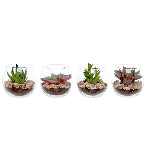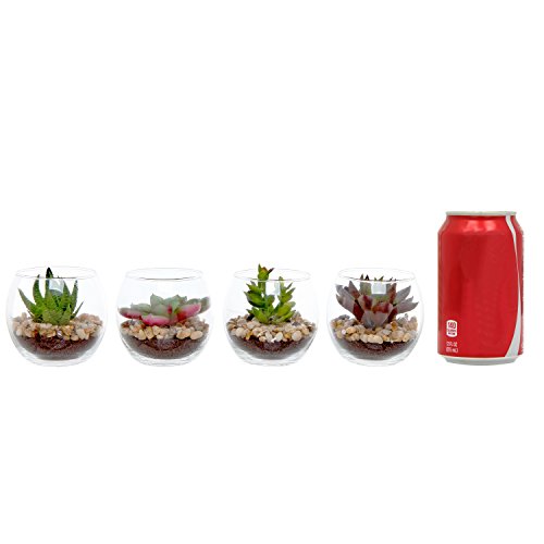 Bring natural-looking greenery to your daily life with this set of 4 artificial succulent plants. Each realistic-looking plastic plant is housed in a clear glass vase and nestled in a bed of pebbles for a look at this both modern and natural. These miniature vases would make a perfect set for a housewarming or a wedding gift, and you can also use them to lend a stylish, modern touch to your own home decor. Add a little maintenance-free greenery to your household with this set of 4 artificial succulent glass displays.**Official MyGift® product.**