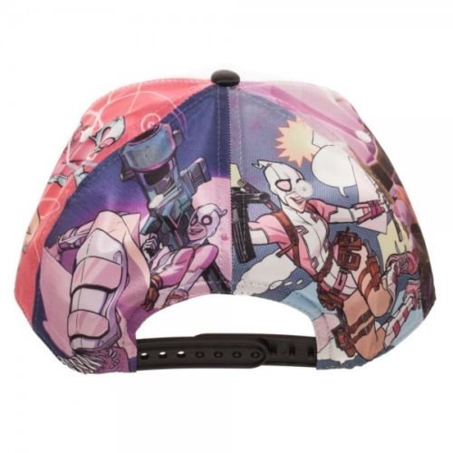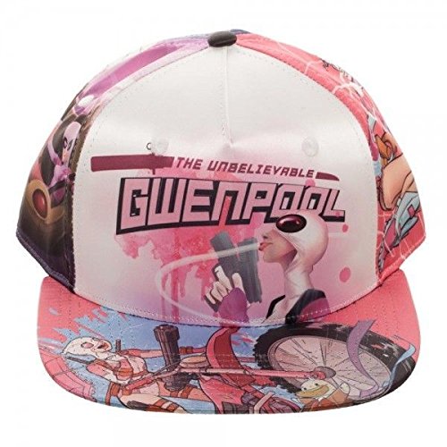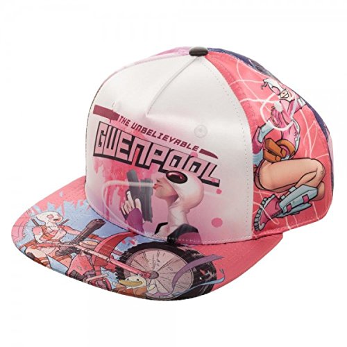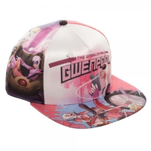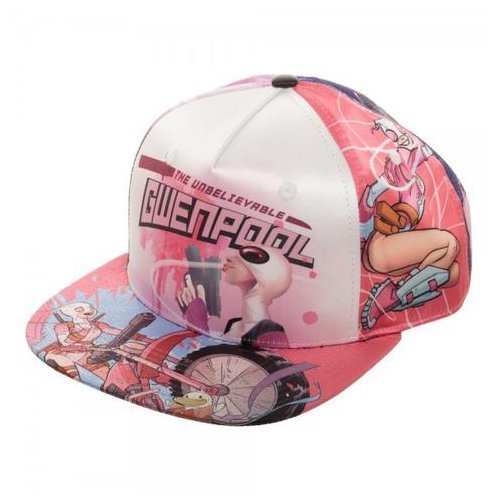 Product Description Marvels The Unbelievable Gwenpool Sublimated Faux Satin Adjustable Snapback Hat. Design features an all over sublimated character print on a multi color pink white flat bill snapback cap. 0