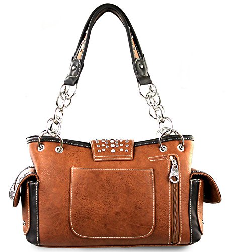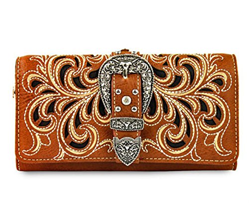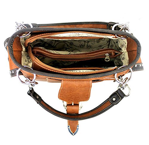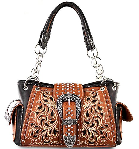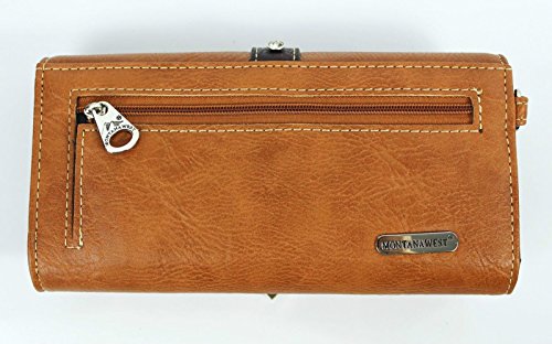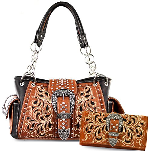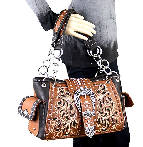 Studio : Western Fashion Publisher : Western Fashion Binding : Apparel Product Description New Montana West® Concealed Carry, Silver Longhorn Buckle Western Bag Wallet- Brown Product Code: MW198G-8085 Bag Measures: Length: 13 Height: 8 Depth: 85 Strap Drop: 10 * Silver Floral Longhorn Belt-Buckle on Flap with Magnetic Closure, Zipper Top Closure Underneath * Floral Cut-out Embroidered Design * Silver tone Hardware, Clear Rhinestones ? A Vertical zippered pocket on the back for Concealed Carry (9 x 5.5 ) or other valuables, plus a Pouch Pocket on Back (6 x 5 ) * Pocket on each Side * Metal Footed Bottom * 2 studded Carrying Handles w/ Chain Accents * Zipper Top closure Inside: - Montana West Lining, 2 Compartments, 2 Zipper Pockets, 2 Open wall Pockets Wristlet Wallet Length: 7.5 Height: 4 Depth: 1 Wristlet Strap: 7 * Silver Floral Longhorn Belt-Buckle * Floral Cut-out Embroidered Design * Silver tone Hardware, Clear Rhinestones ? Single removable strap to convert the wallet into a wristlet ? 3 open compartments, 2 bill compartments, 8 Card Slots, and 1 Zipper Pocket