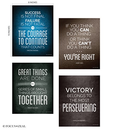 -. Feature : MOTIVATIONAL WALL ART. These posters provide motivation, inspiration and drive for the home, office, gym, workout space classroom or dorm room. / SET OF 4 POSTERS. Each set includes 4 different inspirational posters. / READY TO FRAME. 8x10 inch posters are printed on 100# paper. Ready to frame. Frame not included. / GREAT GIFT IDEA. Our motivational posters make a great gift for entrepreneurs, office, students, teachers, classroom, home gym or more. / MADE IN USA AND UNIQUE DESIGN. Copyright FocusandZeal.com (c) 2016 All rights reserved.