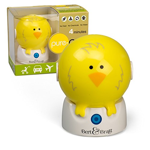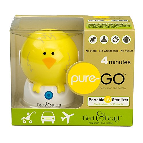 Portable UV sterilizers are an important 21st century tool to keep your child's pacifier or baby bottle clean. Bert & Bratt delivers quality UV sterilizers to make it convenient for individuals to make their health and well being a priority. By reducing contact with commonly found germs you are lowering your child's risk for infections such as pneumonia, ear infections , strep throat and bronchitis. Forget about boiling water, using chemical cleaners, dishwashers or steam to sterilize. Keep your sterilizer in your nursery, diaper bag, purse or car so you always have the ability to sterilize whenever the need occurs. Bert & Bratt UV Sterilizer will work on pacifiers, bottle nipples, small teething toys and some sippy cup tops. Be confident that you are reducing your child's risk of coming into contact with harmful germs and bacteria in 4 minutes with just the push of a button. Bert&Bratt products have a small UVGI light that kills germs using a dual-action process. The oxygen in the air reacts with a range of 254 nm wavelengths creating ozone to safely eliminate up to 99.9% of germs and bacteria. The only by-product of this process is oxygen, leaving the pacifier without any residue or harmful bacteria. Simply push and hold button until light flashes. When flashing has stopped, sterilization has occurred. It breaks down bacteria and exposes the DNA/RNA, quickly destroying the cell. UV light is often used in hospitals to sterilize equipment as well as to remove germs from water and air. Simple yet effective. Protect your baby's well being with the Bert & Bratt portable UV sterilizer.Feature