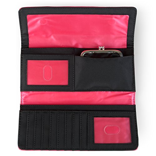Feature : Entry: Top Flap / Materials: Faux leather / Exterior Pockets: 1 Zipper / Interior Pockets: 8 credit card slots, 2 ID windown, 2 open pockets