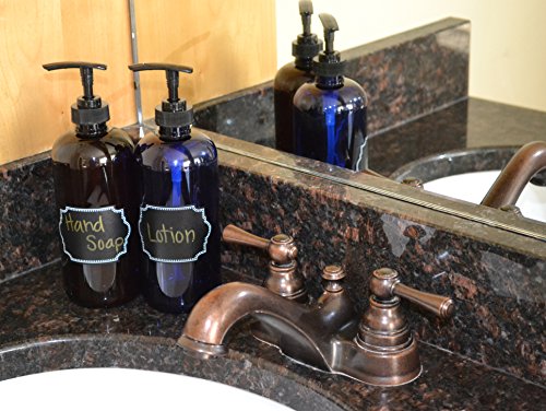 Choose your preferred containers among these sets of amber and cobalt blue glass bottles that come with elegant black plastic pumps or stainless steel pumps for easy dispensing. Beautiful decorative chalkboard labels are included with each set of hand soap dispenser pump bottles to make keeping track of your products a cinch! Use permanent metallic markers for best results.