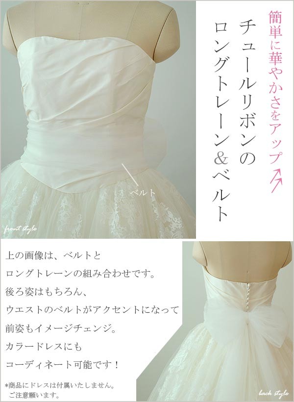 | 商品の説明 | 国内自社アトリエにて1点1点製作しております。 シンプルなドレスにプラスして手軽に華やかさをアップしてくれる、チュールトレーン&ベルトです。