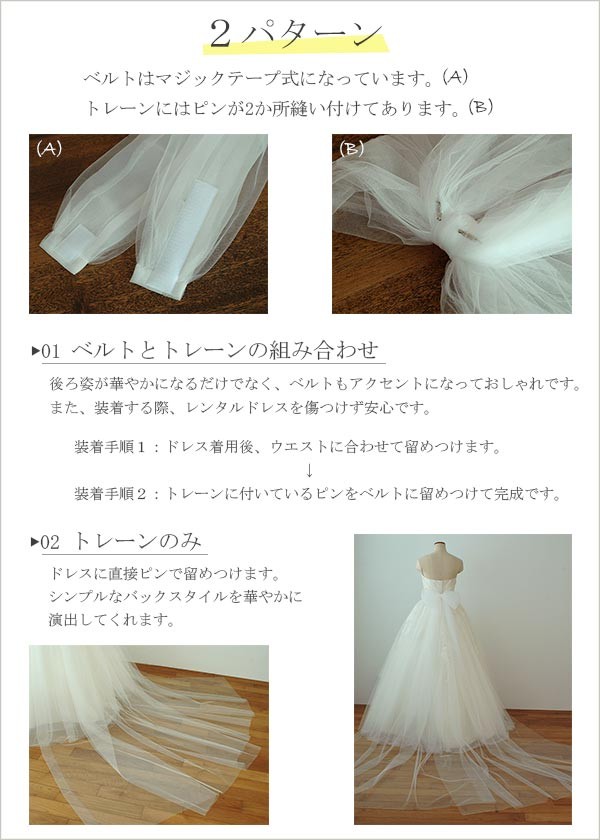 ベルトにはマジックテープが縫い付けてあるので、手間なく装着していただけます。 また、サイズ調節も簡単です。 リボンの裏側には、ピンが縫い付けてあるので、ベルトもしくは、ドレスに留めつけてください。 (トレーンはピンで取り付ける仕様となります。 ベルトがあればドレスを傷つけず、レンタルドレスにも安心して留めつけられます。)