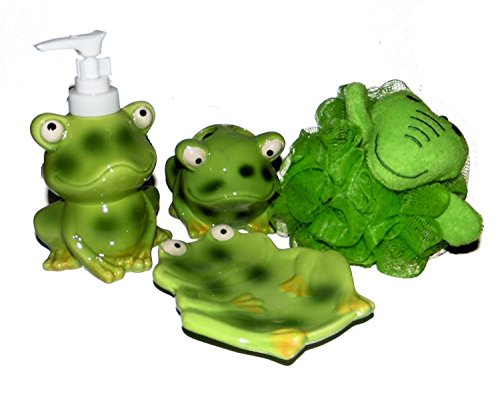 Frog Bathroom Accessories - Lotion Soap Dispenser, Soap Dish, Toothbrush Holder and Bath Sponge