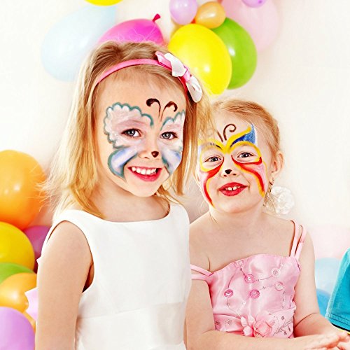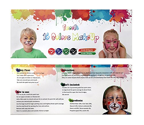 INCLUDES ALL ESSENTIALS: This face painting set is designed to let you get right to the fun part. It comes with 16 colors, 30 Stencils, and 2 brushes - the perfect combination to let your children have fun and fit to the theme. It is perfect for Halloween and other theme parties and holidays.