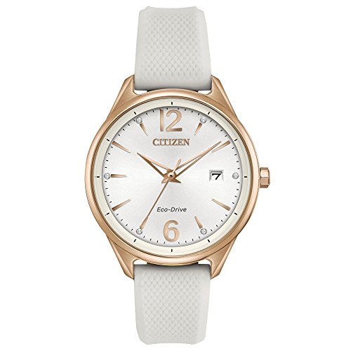 37mm rose gold-tone stainless steel case Mineral CrystalJapanese Quartz movement/ Eco-Drive, Never needs a battery, Charges in natural or artificial lightSilver white-tone dial with rose gold-tone accents and Swarovski crystals3-Hand MovementDate Window 50 meter water resistance White textured silicone strap completed with a buckleCitizen Style#: FE6103-00A