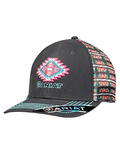 -. Binding : Apparel -. Brand : Ariat -. Department : womens -. Feature : Gray crown and bill / Embroidered Aztec design / Ariat signature logo / 7 post snap closure / Medium high crown -. ProductGroup : Apparel -. ProductTypeName : HAT -. Title : Ariat Women's Snap Back Baseball Cap