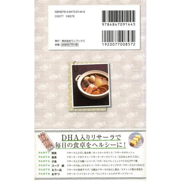 【商品基本情報】 商品名称:DHA入りリサーラのフィッシュソーセージレシピ 著者/出版社:ミニCookシリーズ/ミニCookシリーズ 初版発行日:2013/04/12 サイズ:新書判 ページ数:128 ISBN/JAN:9784847091445/4528189518872