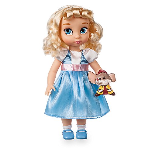-. Feature : Genuine, Original, Authentic Disney Store / Cinderella wears a blue satin dress with sheer puff sleeves and silver trimmed bodice / Soft, sheer peplum with pink band at waist / Delicate lace trim on socks / Includes plush mouse friend Jaq with embroidered features