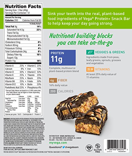 Enjoy anytime nutrition when you're too busy to sit down. With Vega Protein+ Snack Bar, you can still get protein, veggies and greens, fiber, and vitamins on-the-go. Vega Protein+ Snack Bar contains 11 grams of protein from a multisource plant-based blend, veggies and greens, vitamins and 4 grams of fiber-all made with real plant-based food ingredients. With it stashed in your bag, you'll be prepared with nutritional building blocks to take the curveballs life throws at you today. Vega Protein+ Snack Bar comes in two mouthwatering flavors: classic Chocolate Peanut Butter and rich Chocolate Caramel so you can reward your active life. Vega Protein+ Snack Bar is Non-GMO Project verified, gluten-free, and certified vegan. Note: See nutrition information for saturated fat content. Vega Protein+ Snack Bar contains at least 10% more DV protein than Vega Snack Bar. Protein content of Vega Snack Bars is 5g (4% DV) per serving; Vega Protein+ Bars has 11g protein per serving.Feature