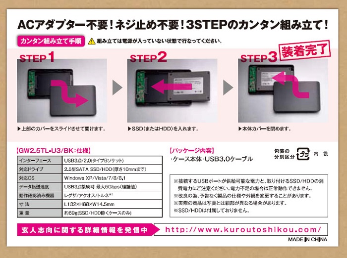 USBバスパワーで動作可能、ACアダプター不要。 USB3.0対応で高速転送が可能。 スライドカバーでネジ不要の簡単取り付けを実現。 シックでツヤのあるブラックボディ、青く光るアクセスランプを採用。