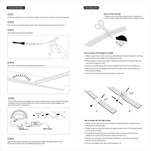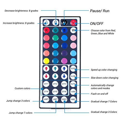 - √BEST DECORATION LIGHTS: The led will not dim if you connect them from each output of the IR receiver (like main pic). 44keys controller contained a DIY fuction , Press "DIY" botton and then just long press one of the arrow button to set it. Also it have dimming and brightness control.