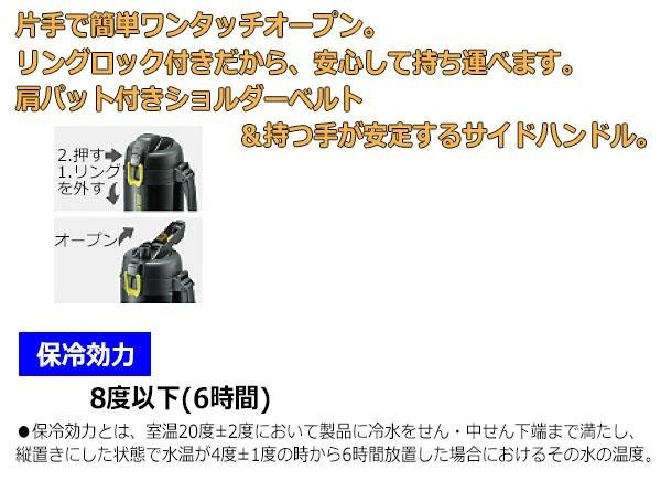 魔法瓶構造でしっかり保冷ができ、開閉ボタン部分にはリングロック付きなので、安心して持ち運べます。肩パット付きショルダーベルトと持つ手が安定するサイドハンドル付きです。 |