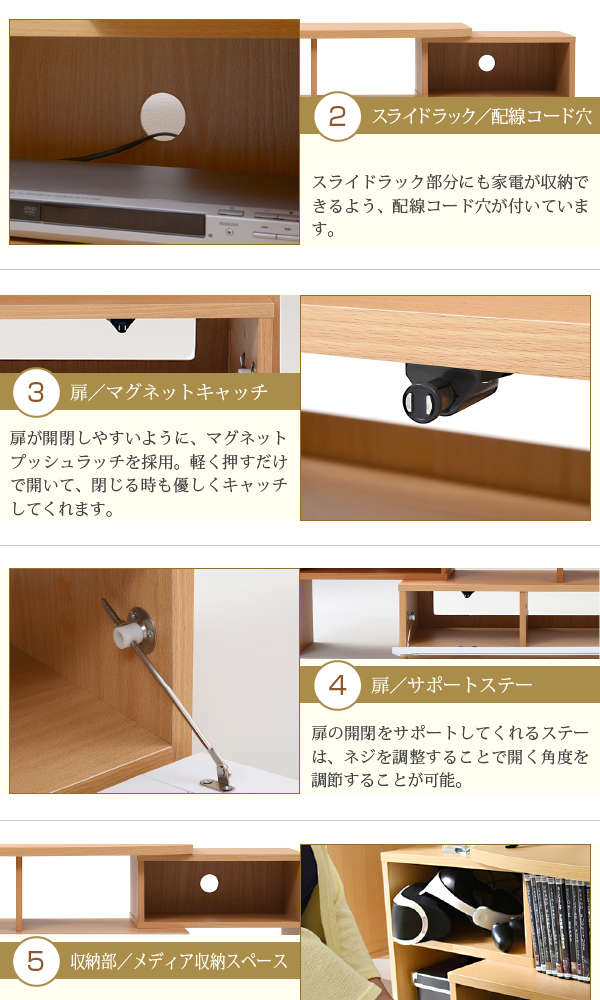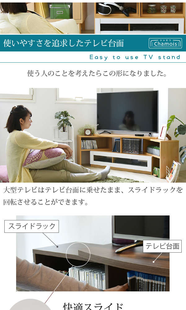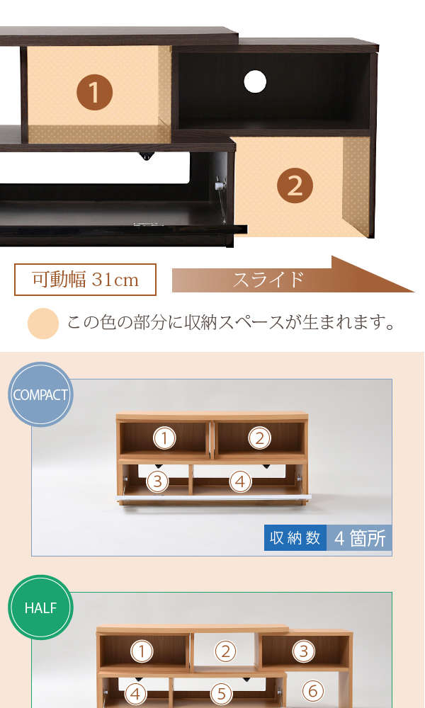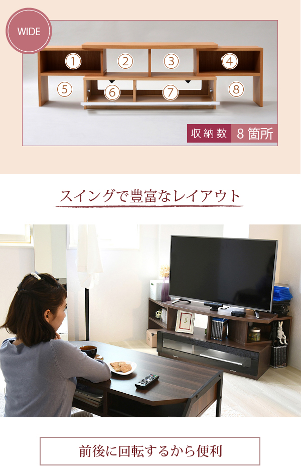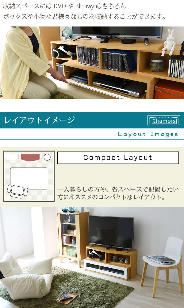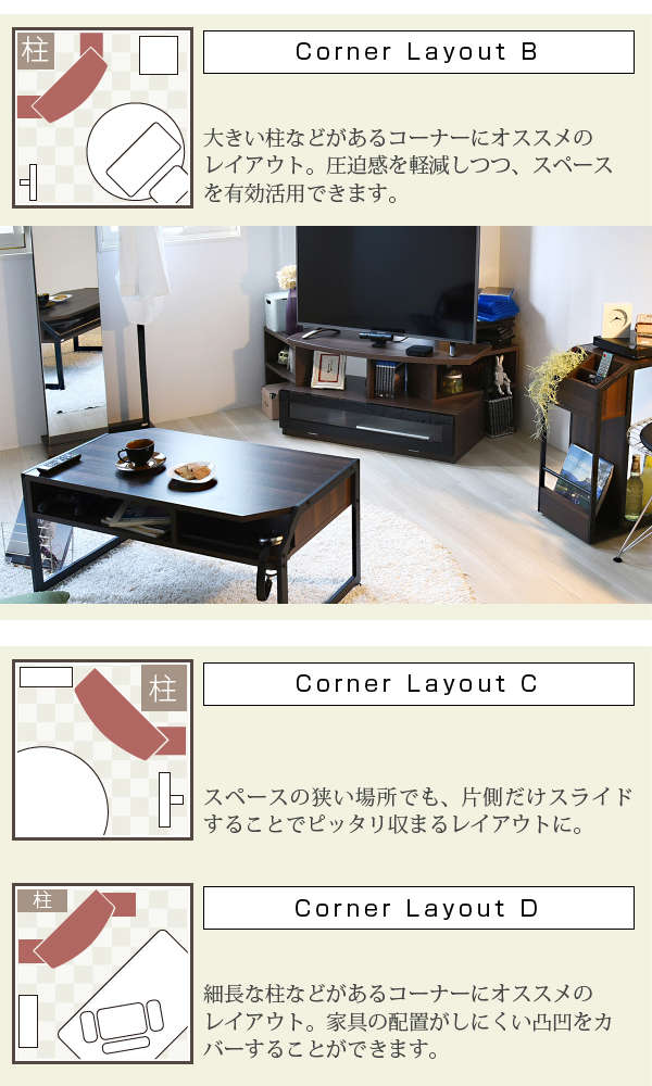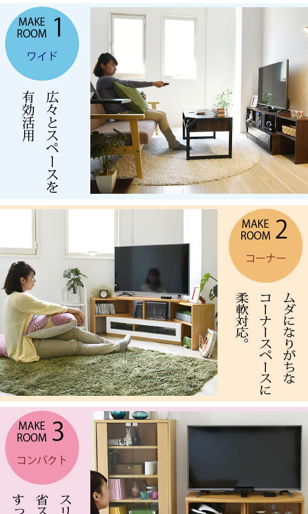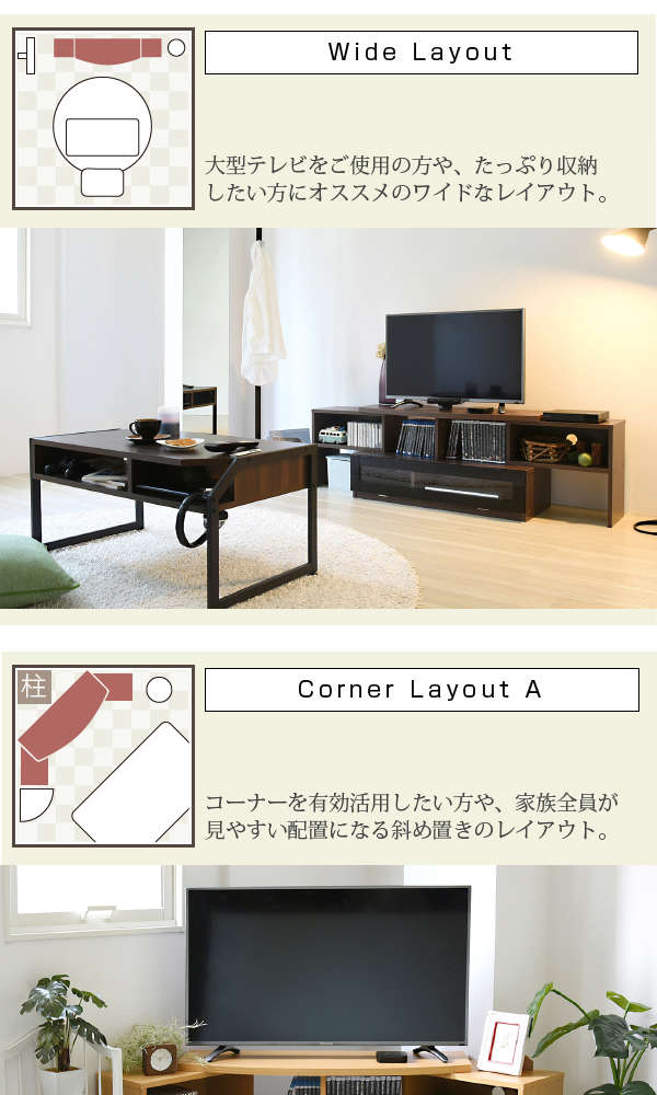 ●コンパクト、ワイド、コーナー3タイプのレイアウトが可能なテレビ台